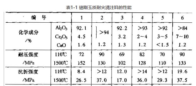 表1-1是鉻剛玉耐火澆注料的性能。表中1號材料以板狀剛玉為耐火骨料,電熔白剛玉為粉末。2號以致密剛玉為耐火骨料和粉末。其余采用電熔白剛玉為耐火骨料和粉末。耐火骨料的臨界粒徑為10mm或8mm,總用量約為70%;同時,A-Al2O3起微粉、工業(yè)氧化鉻和少量UF-SiO2也被用作耐火粉。編號5以CA-80水泥為結(jié)合劑,其余為CA-70水泥。同時加入減水劑和緩凝劑。從表中可以看出,Al2O3和Cr2O3的含量大于94%,材料的純度非常高。體積密度大于3.10g/cm3,材料致密。110℃干燥和1500℃燃燒后,耐壓強(qiáng)度分別大于69mpa和102mpa。除編號1外,1500℃燃燒后線變化為負(fù)值,即略有收縮。總之,高純度鉻剛玉耐火澆注料性能優(yōu)異。